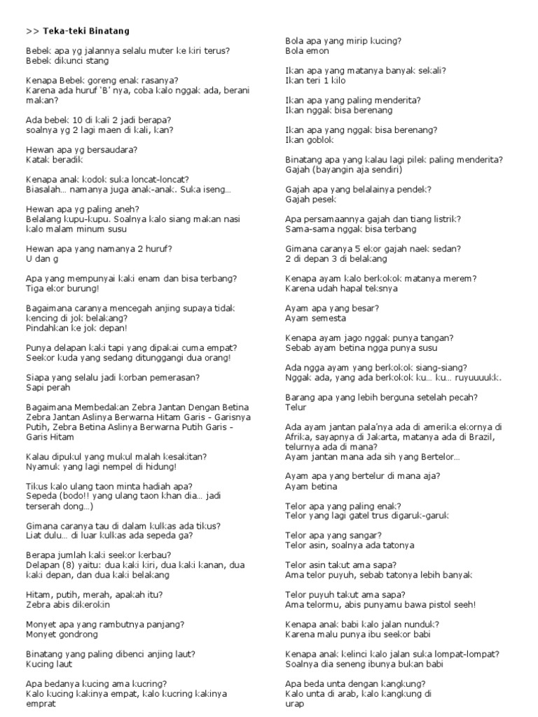 Kenapa di dalam bajaj nggak ada nyamuk. Ketbien sudah dari dulu apa bahasa inggrisnya kucing hitam mati. Apa bedanya kucing ama kucring. Kambing apa yang kepalanya 2 kupingnya 3.