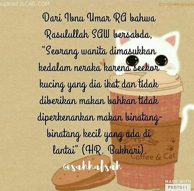 Sudah hampir satu bulan lalu satu keluarga kedatangan seekor kucing kampung yang lagi hamil. Telah menceritakan kepada kami ismail berkata telah menceritakan kepadaku malik dari nafi dari abdullah bin umar radliallahu anhuma bahwa rasulullah shallallahu alaihi wasallam bersabda. Nabi muhammad saw bersabda ada seorang perempuan yang masuk ke dalam neraka karena perkara seekor kucing. Dia tidak memberinya makan.