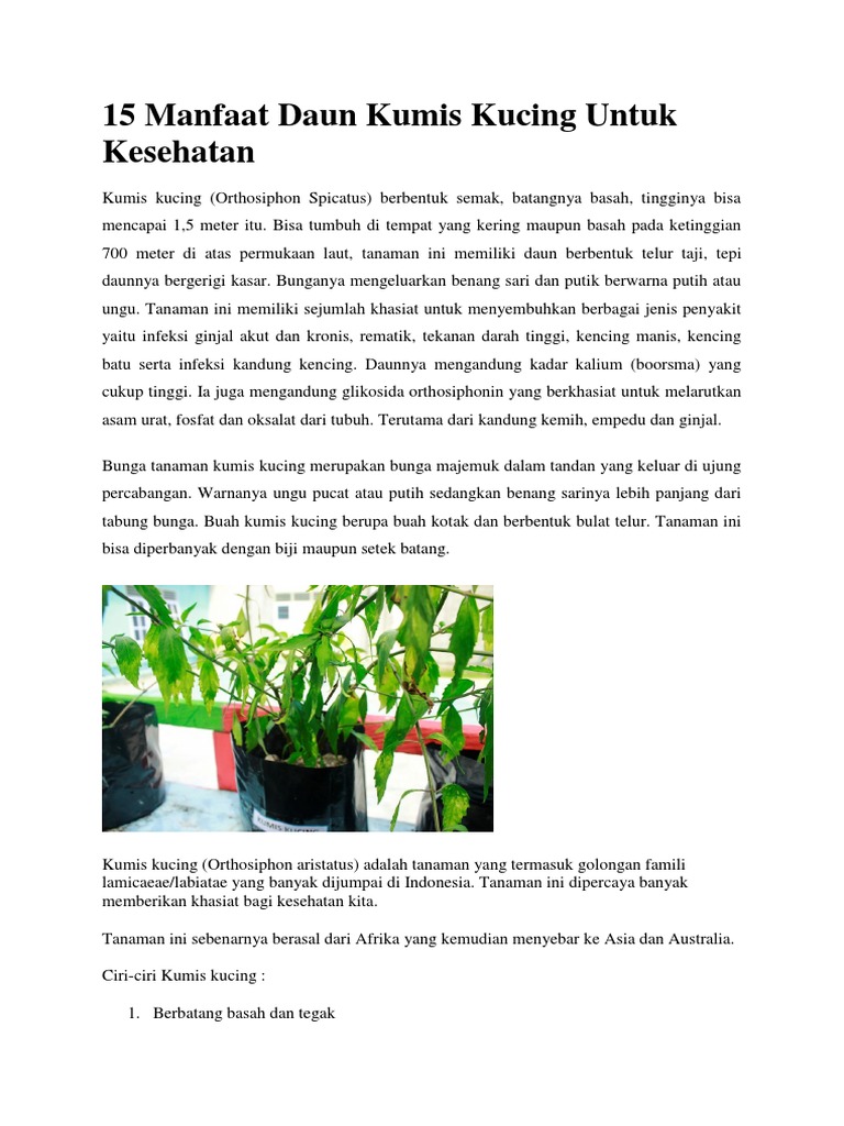 Manfaat tanaman daun kumis kucing basah maupun kering digunakan sebagai bahan obat obatan. Tanaman ini merupakan ramuan obat yang banyak ditemukan di seluruh china selatan benua india asia tenggara dan sebagian australia. Kumis kucing merupakan salah satu jenis tanaman obat yang biasa digunakan dalam pengobatan tradisional atau herbal. Dikutip dari biofarmaka ipb terdapat dua jenis.